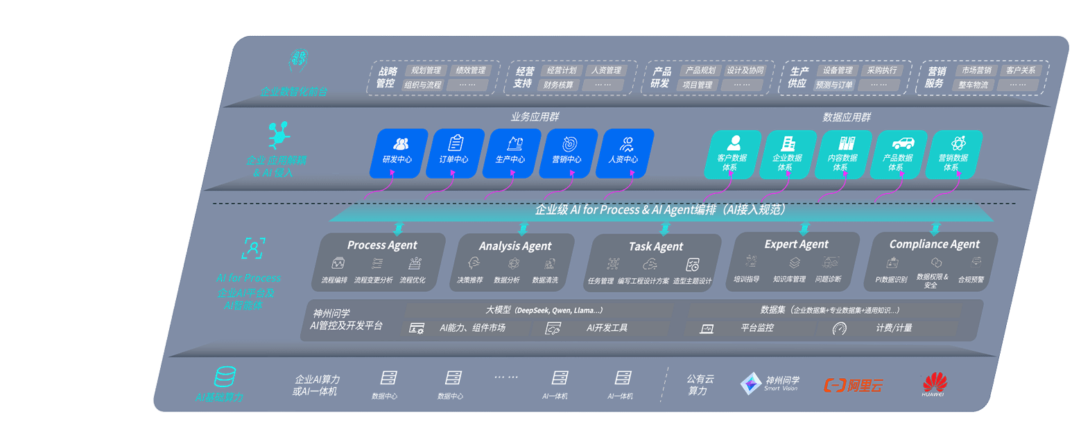 端到端的一站式AI工作空间深度融合了从企业战略规划到日常经营的全流程业务板块,,,定向解决车企内部领域多、、、、部门多、、、链条长、、、场景碎片化等难题,,,支持车企快速构建以AI为核心的生产力写作体系,,实现任务执行与AI能力的无缝集成与交互