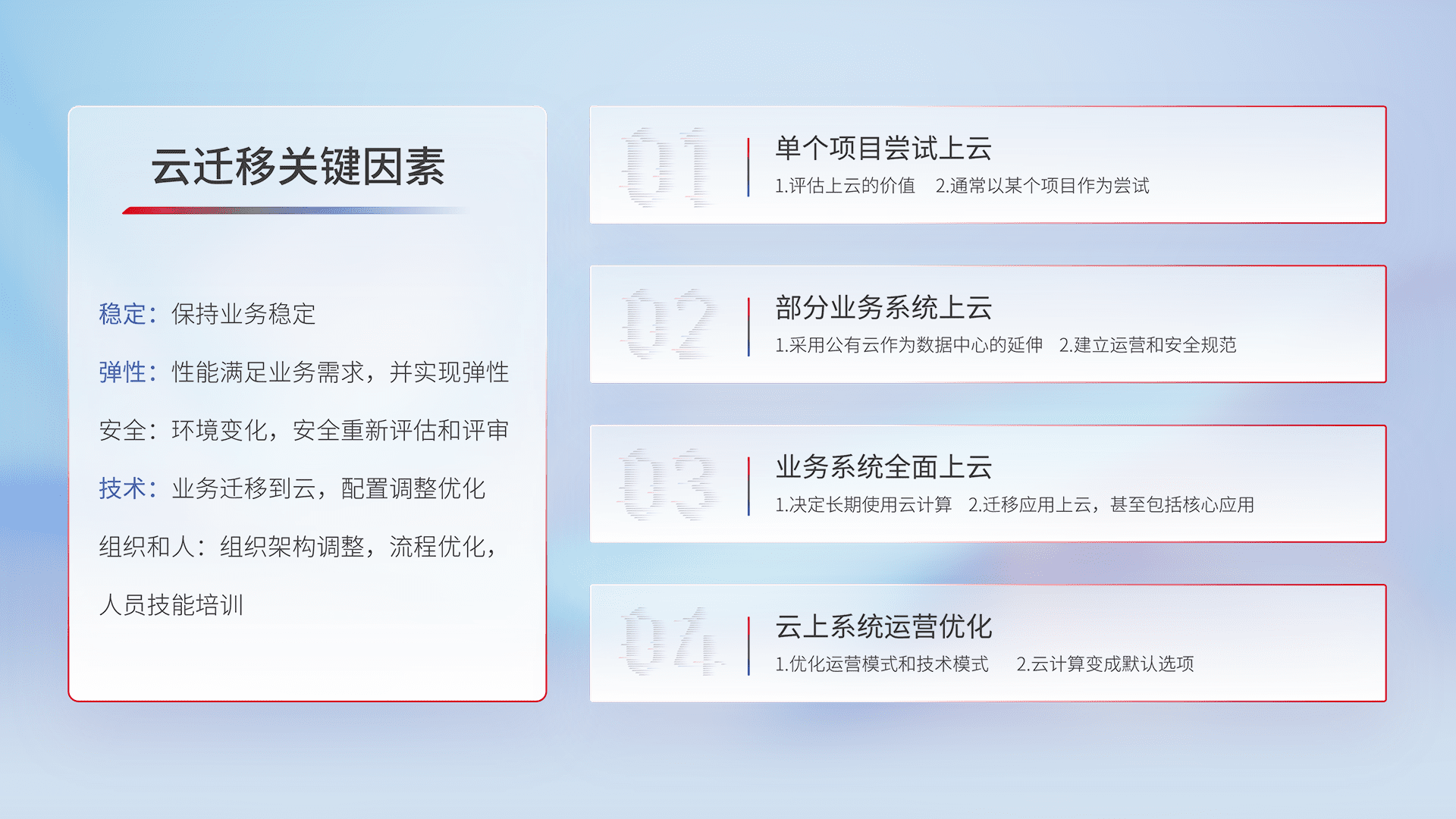 结合实际业务,,,从规划设计、、、云平台选型、、、、云原生改造、、数据迁移、、、、集成交付,,,,迁移全过程为客户识别最佳上云路径,,做好风险识别管理,,,,设计网络架构、、、、身份权限、、、安全审计合规、、、操作审计、、日志审计、、、、监控告警策略、、、、多站点容灾设计等,,对云上基础设施进行整体规划,,,提升IT治理水平,,,以满足弹性、、、、高可用、、高性能的需求。。