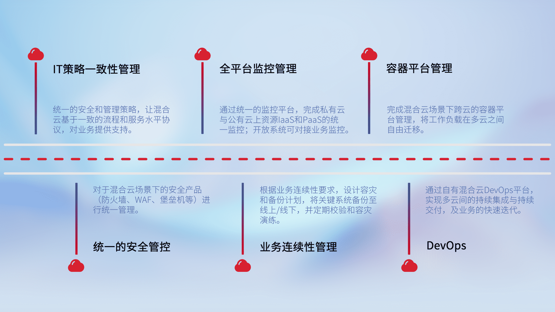 通过多云纳管,,,,以统一的资源数据模型把客户的云资源进行抽象和封装,,,,进而实现对多云资源的统一操作,,,保障云资源管理的可靠性、、、、稳定性与可用性。。。。量身定制化运维内容,,,,配置、、开发运维、、、补丁管理、、、备份、、监控、、认证和访问管理、、审计和日常巡检等,,保障在用云过程中的可靠度,,,稳定度以及高可用率。。。