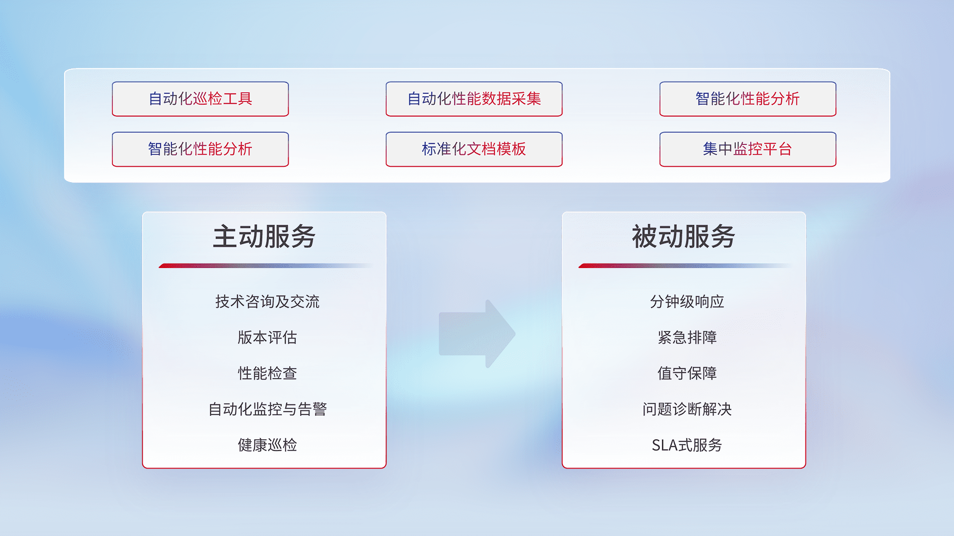 智能化工具和标准化文档,,,保障服务质量,,,提供主动服务(包含技术咨询、、、、版本评估、、、、性能检查、、自动化监控与告警、、健康巡检)和被动服务包含(分钟级响应、、、、紧急排障、、值守保障、、问题诊断解决、、SLA服务)。。。