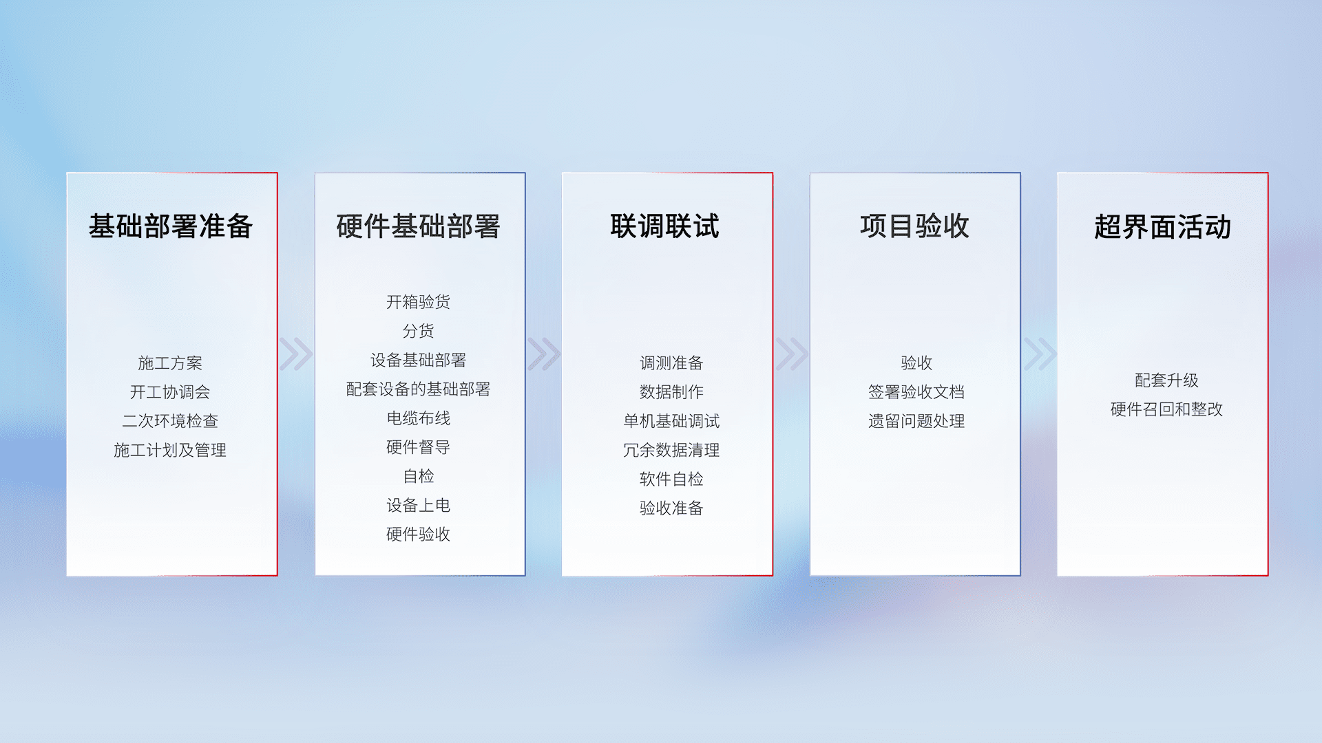 从基础部署准备、、硬件基础部署、、联调联试、、、、项目验收、、越界面活动的全过程可追溯,,,,保证施工质量和进度。。。